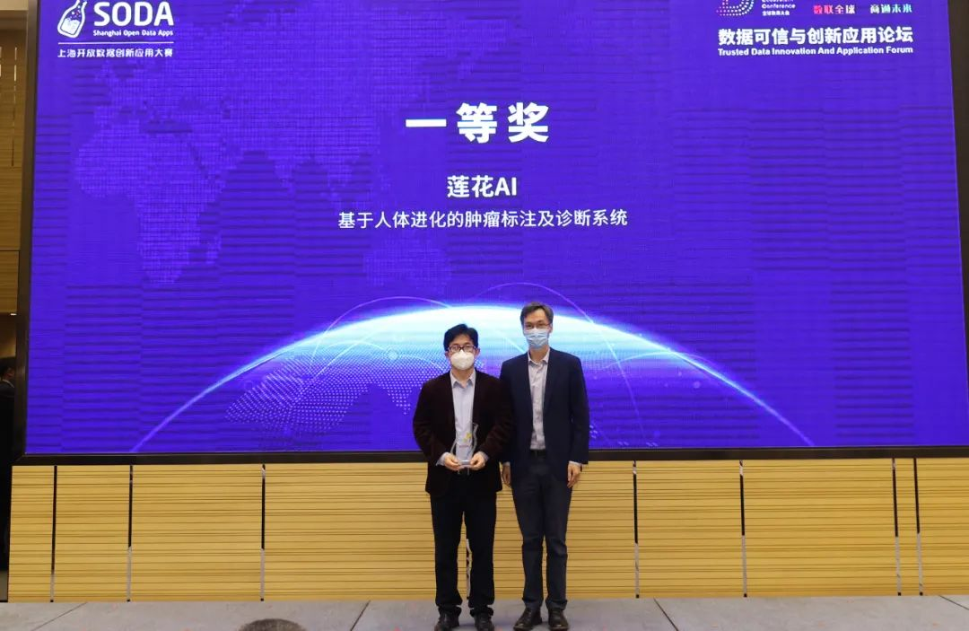 上海市大数据股份有限公司总裁刘九评,市北高新集团党委副书记、总裁陈军,静安区科委副主任吴启南为二等奖、最佳应用案例获奖团队颁奖
